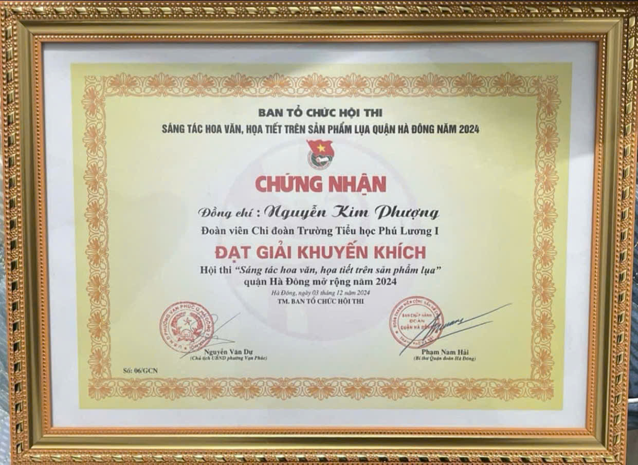 Tập thể Trường TH Phú Lương I chúc mừng Cô giáo Nguyễn Kim Phượng đã đạt giải Khuyến khích trong cuộc thi "Sáng tác hoa văn, họa tiết trên sản phẩm lụa quận Hà đông mở rộng năm 2024.